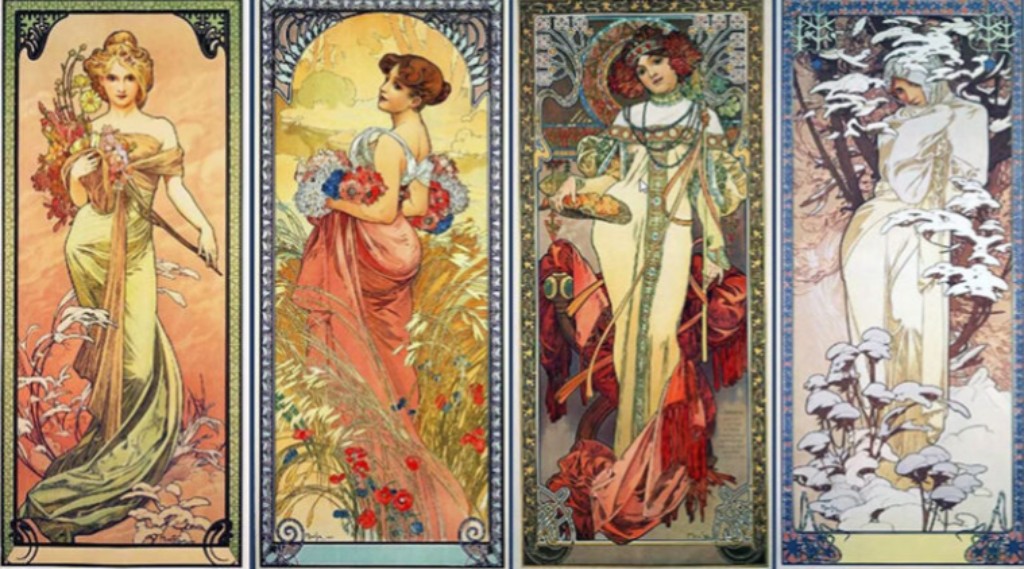 Mas Mucha foi além dos cartazes. Entre 1896 e 1904, criou uma série de painéis decorativos que não anunciavam nada além da própria beleza. "As Estações" (1896), "As Artes" (1898), "As Flores" (1898) e "As Pedras Preciosas" (1900) eram séries de quatro painéis cada, destinadas a decorar lares burgueses. Combinavam figuras femininas alegóricas com ornamentações luxuriantes e demonstravam como o Art Nouveau podia criar arte acessível sem sacrificar qualidade.