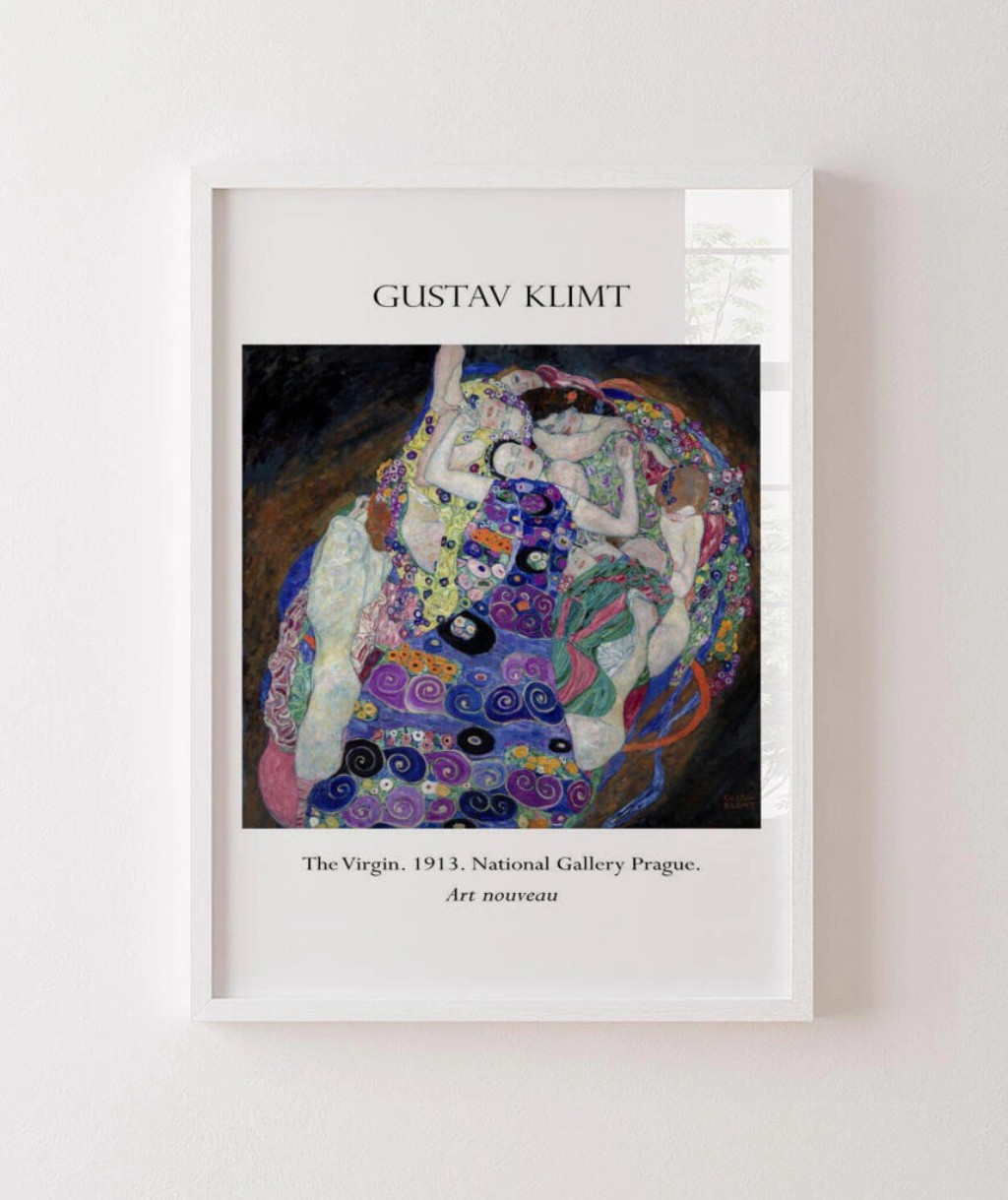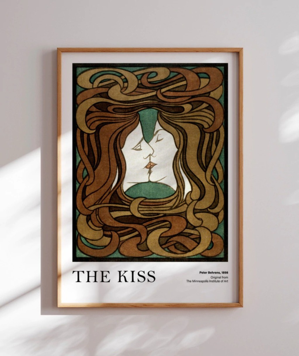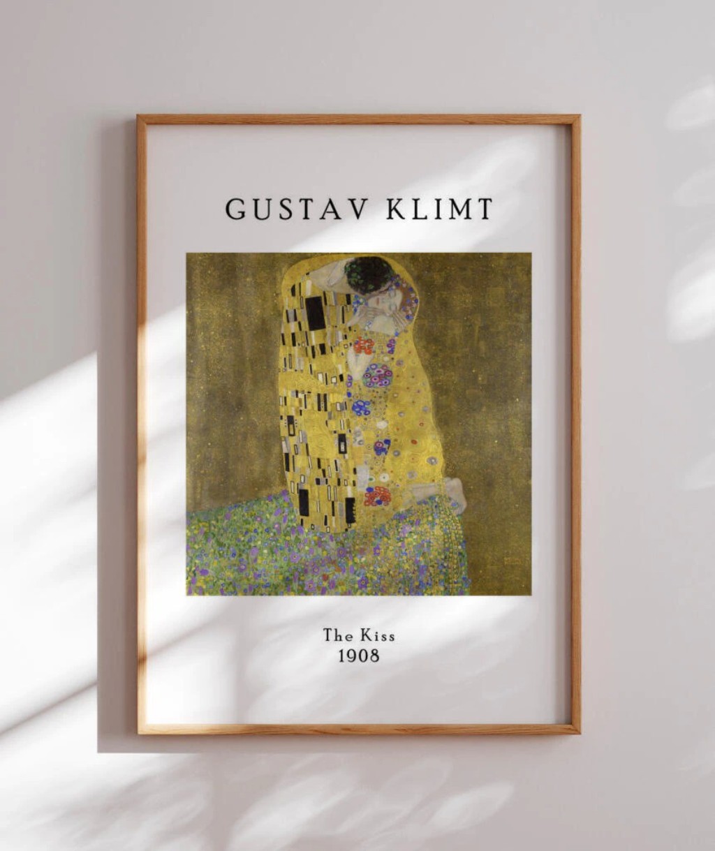 "O Beijo" (1907-1908) tornou-se a obra mais icônica de Klimt e talvez de todo o Art Nouveau. Mostra um casal abraçado, coberto por elaborados mantos dourados. O homem usa retângulos e formas geométricas duras; a mulher, círculos e formas florais suaves. Estão ajoelhados em um prado florido à beira de um precipício, suspensos em um momento de êxtase. A combinação de intimidade emocional com decoração luxuriante captura perfeitamente o espírito Art Nouveau.