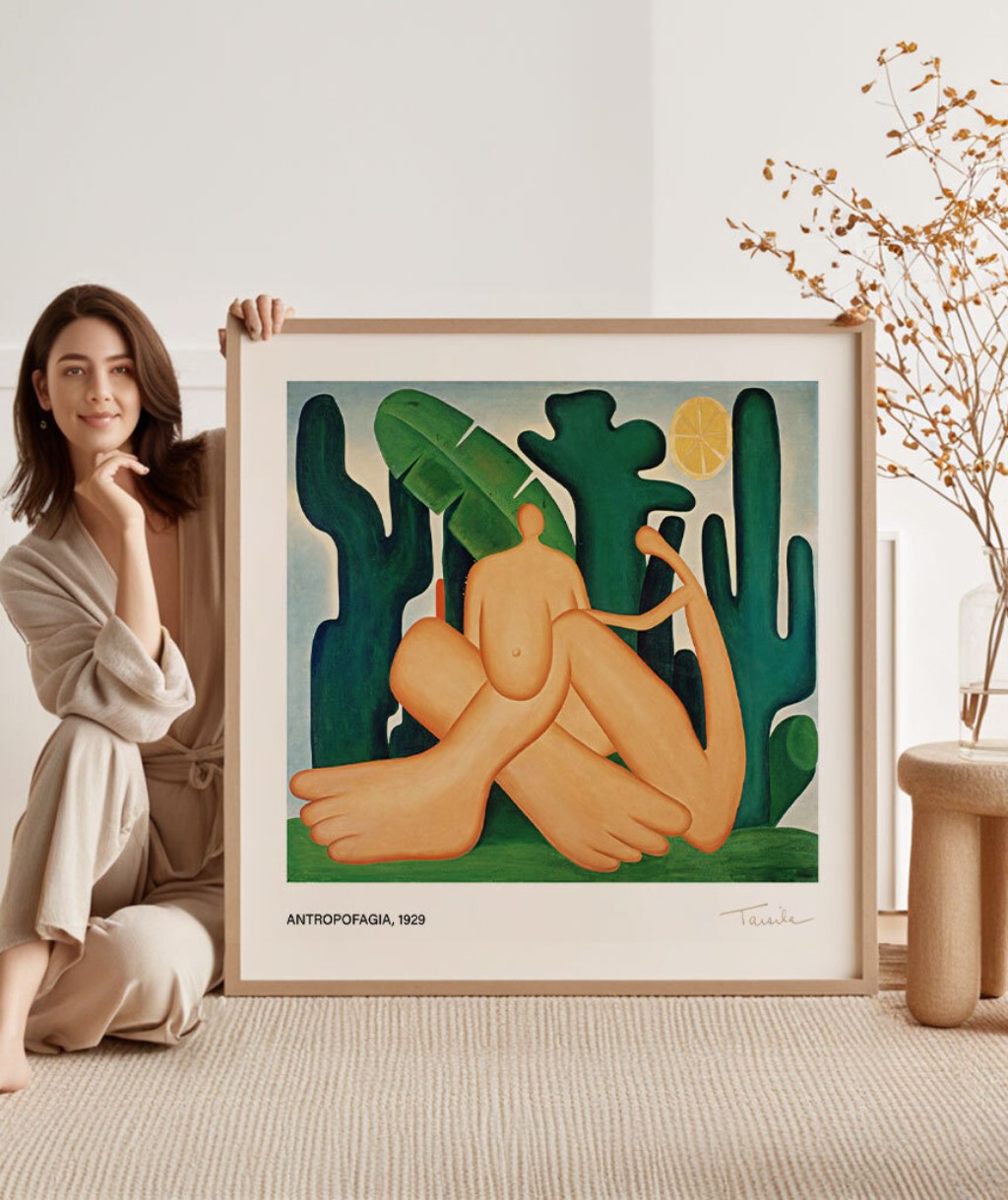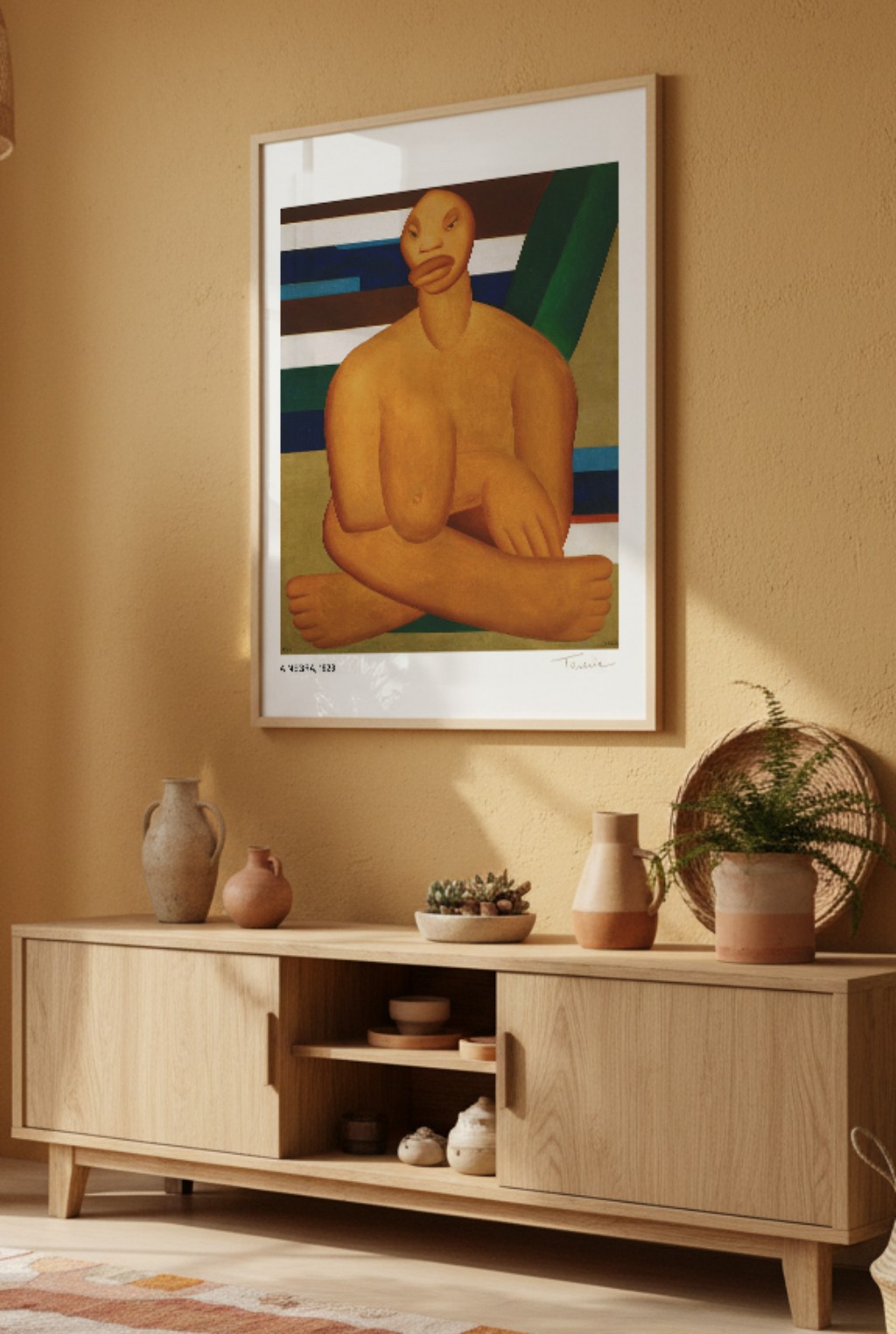 Em Paris (1923), Tarsila estudou com mestres cubistas como Fernand Léger e absorveu as vanguardas europeias, o que a levou a uma profunda reflexão sobre suas próprias raízes. Foi nesse período que pintou "A Negra" (1923), uma de suas primeiras obras genuinamente modernistas. A tela, que apresenta uma figura feminina negra monumental sobre um fundo geométrico, nasceu das memórias de sua infância nas fazendas paulistas. A obra funde a influência do cubismo com uma temática profundamente brasileira, fazendo-a escrever: "Me sinto cada vez mais brasileira".