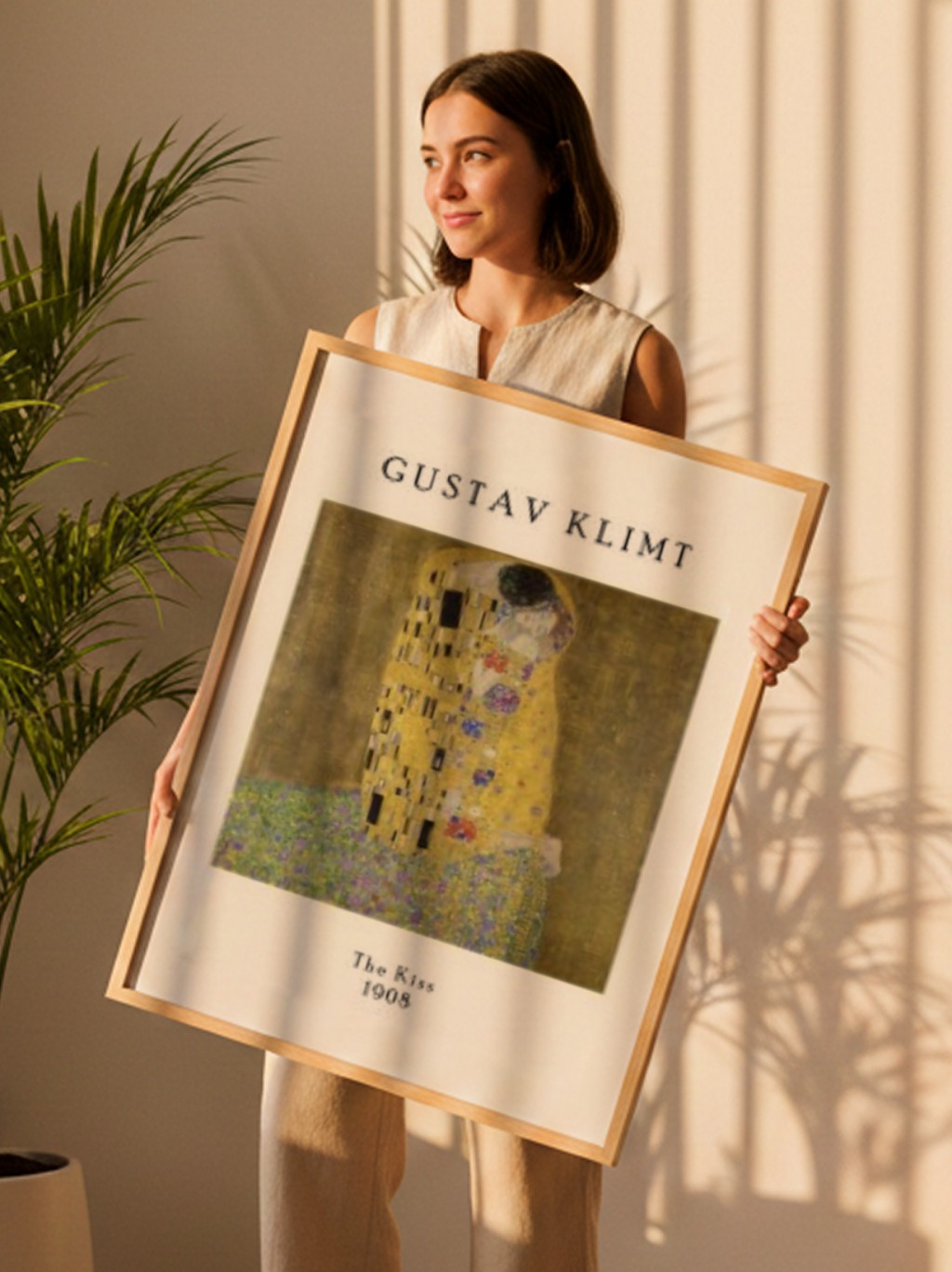 A sensação é de que o tempo para. O fundo não oferece profundidade: apenas luz dourada, tornando o momento eterno. A figura feminina se rende, enquanto o homem beija seu rosto. A fusão de espiritualidade, sensualidade e simbolismo transforma O Beijo Klimt em um ícone global da arte moderna.