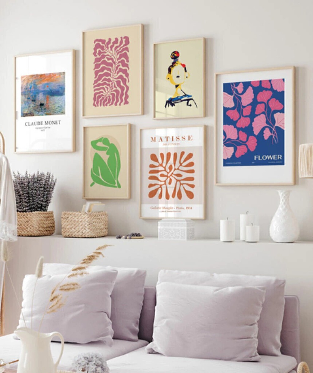 A presença de nomes consagrados traz um peso cultural imediato ao ambiente. Enquanto as pinceladas impressionistas de Monet sugerem calma e profundidade, os recortes de Matisse adicionam vivacidade e ritmo. Essa mistura de estilos cria um ponto focal que atrai o olhar sem sobrecarregar a visão.