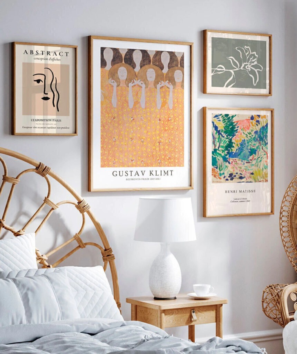 A complexidade das obras de Klimt, conhecidas por sua riqueza de detalhes, é equilibrada por artes botânicas mais simples e cleans. Essa alternância de densidade visual cria o que os designers chamam de "ritmo visual", impedindo que a parede pareça monótona.