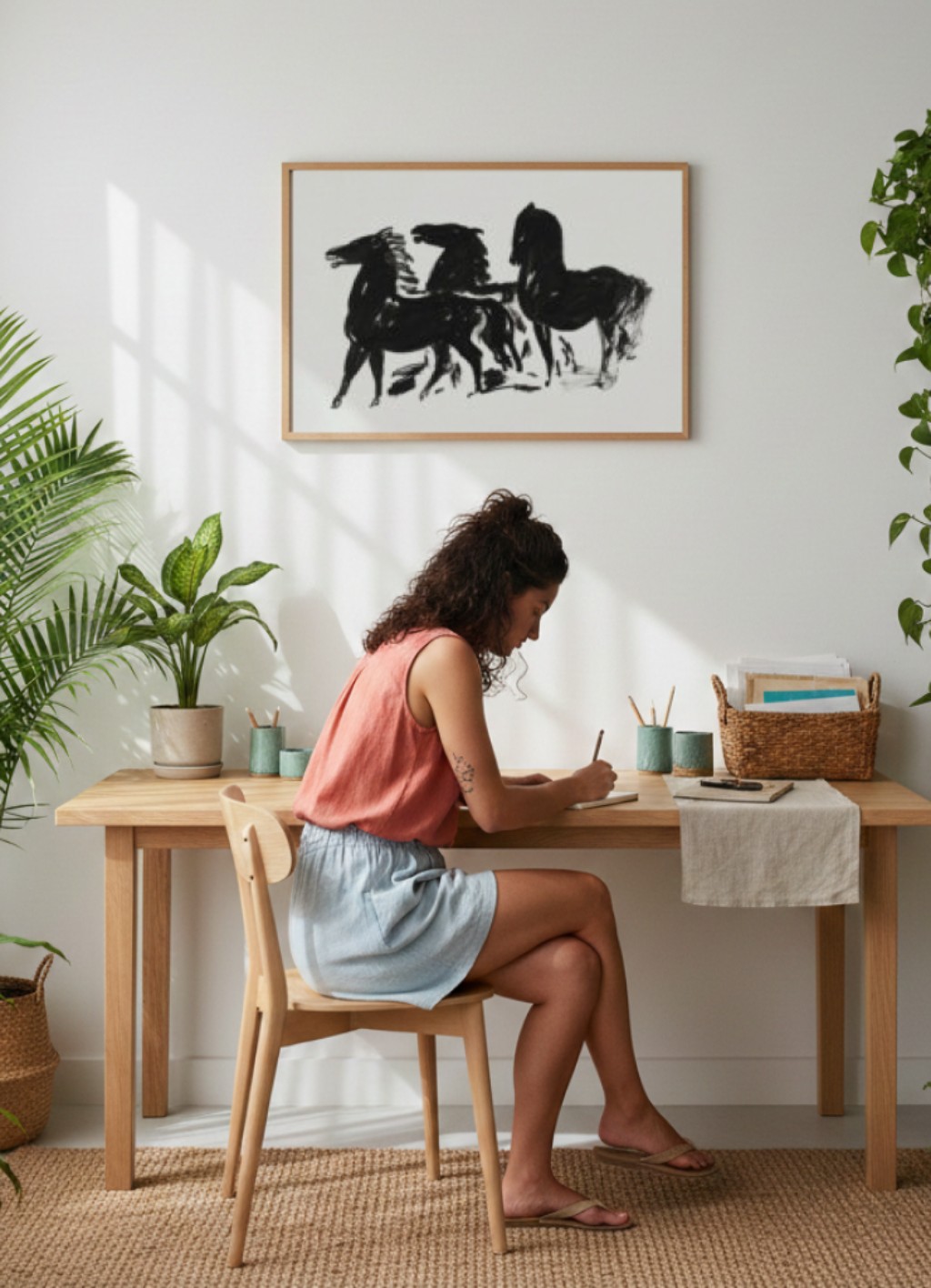 Nos anos finais em Blaricum, os cavalos voltaram ao centro com força renovada. Três Cavalos Pretos (1935–1936), conservado no Rijksmuseum, sintetiza muito do que Gestel havia aprendido em décadas de pesquisa: o traço em tinta preta é gestual e preciso ao mesmo tempo, os três animais estão dispostos em perfil, com as cabeças erguidas em direções ligeiramente distintas. Não há fundo elaborado, não há contexto de paisagem — só o animal e o gesto. É uma obra que parece fácil e não é: vem de alguém que desenhou cavalos ao longo de toda a vida e chegou, na velhice, à versão mais destilada dessa observação.