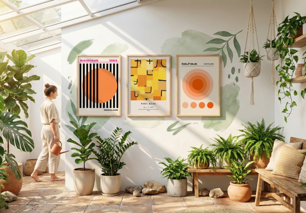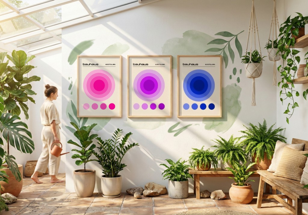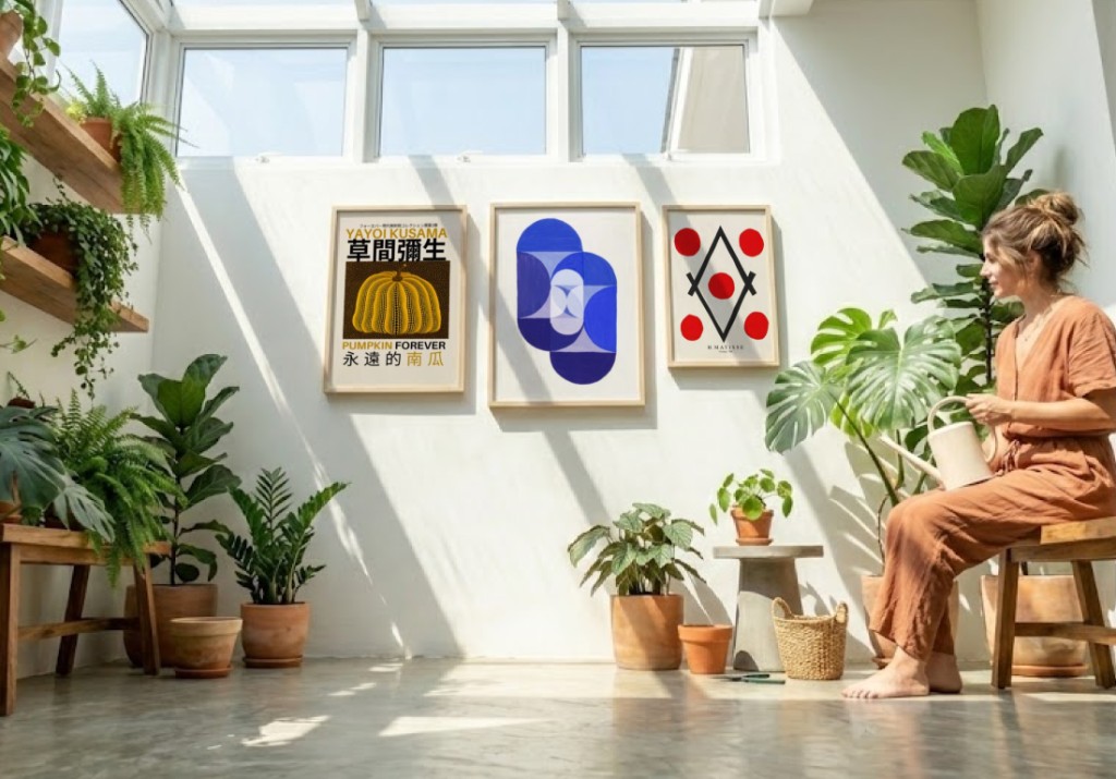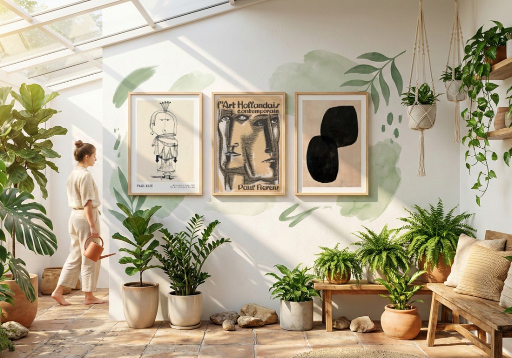 Espaços com muitas plantas criam um contexto único para a escolha de quadros. O verde dominante funciona como cor de base, influenciando toda a paleta do ambiente. Compare os seguintes trios: