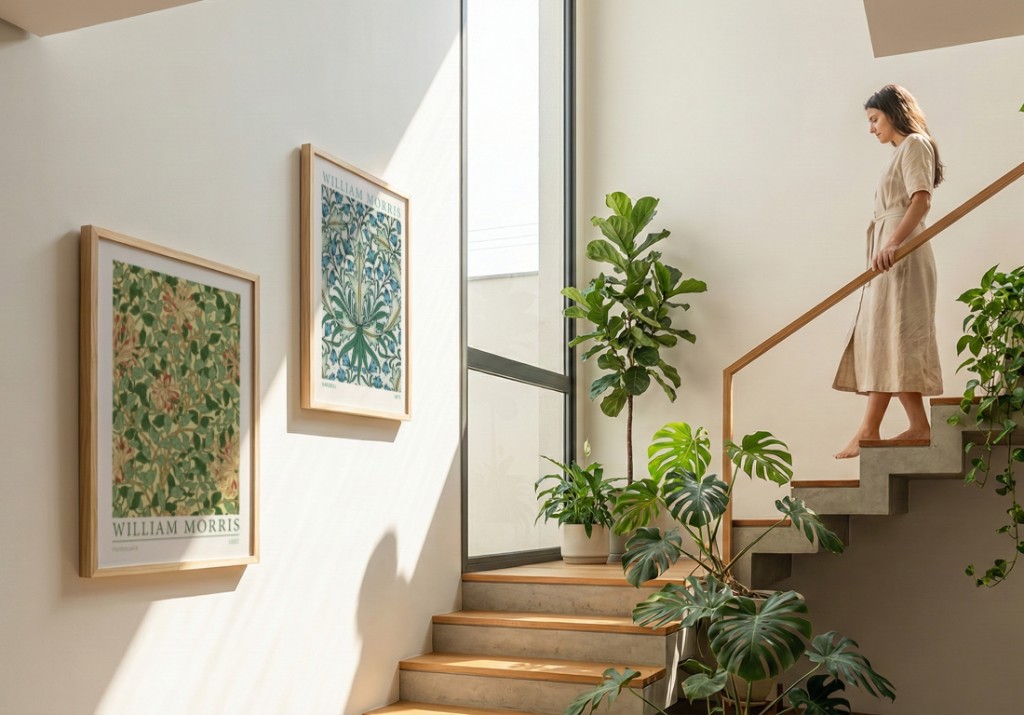 Considere também a luz natural. Plantas precisam de luz, então esses ambientes tendem a ser luminosos. Cores muito escuras ou saturadas podem parecer pesadas. Tons mais suaves, com bom contraste interno no próprio quadro, geralmente funcionam melhor.