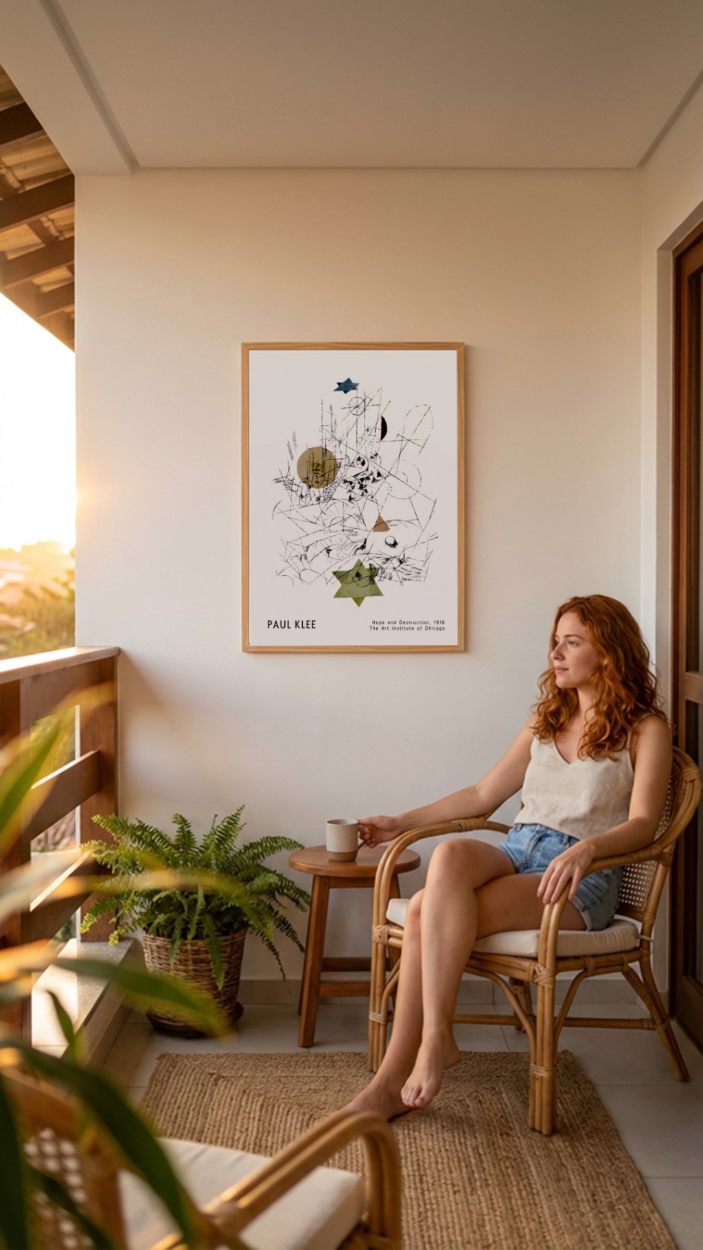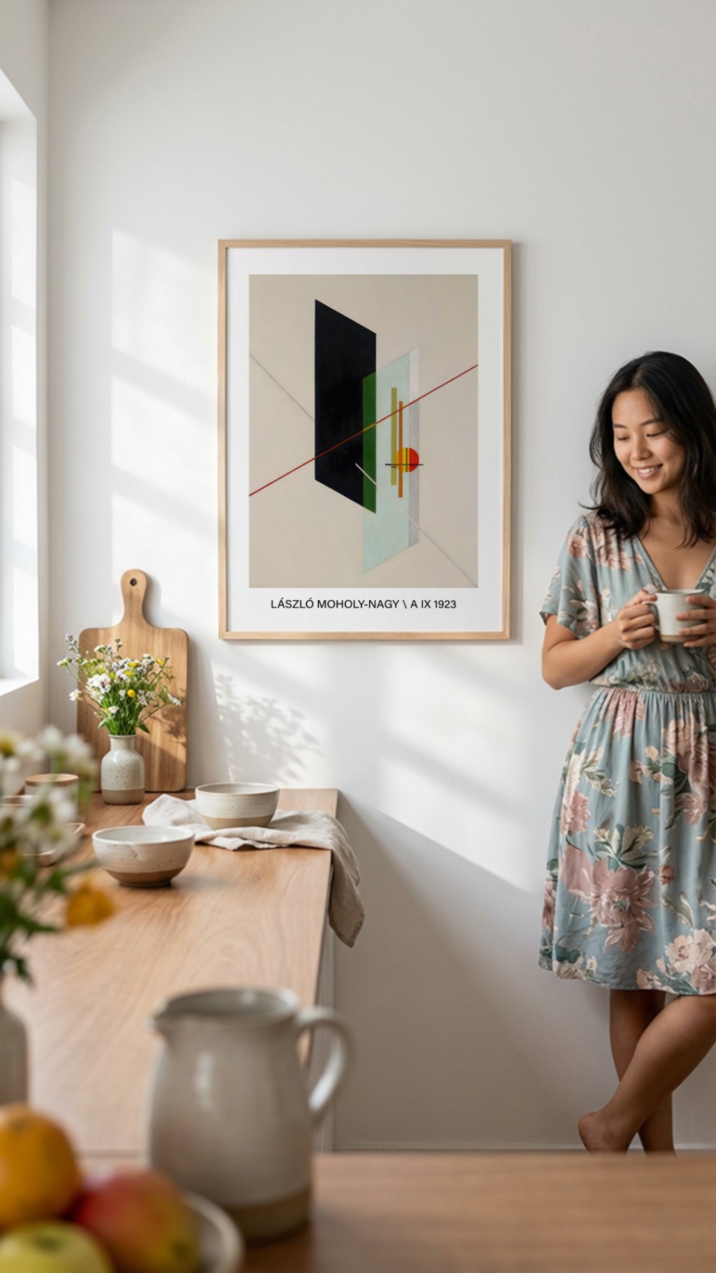 A corrente mais intelectual — e a mais próxima de um sistema. Artistas como Kandinsky, Paul Klee e László Moholy-Nagy acreditavam que formas geométricas e cores primárias tinham significados e efeitos emocionais universais: o círculo remete ao infinito, o triângulo à tensão, o amarelo à leveza, o azul à profundidade. A composição é rigorosa, a paleta deliberada. Não é decoração: é arquitetura visual com intenção precisa.