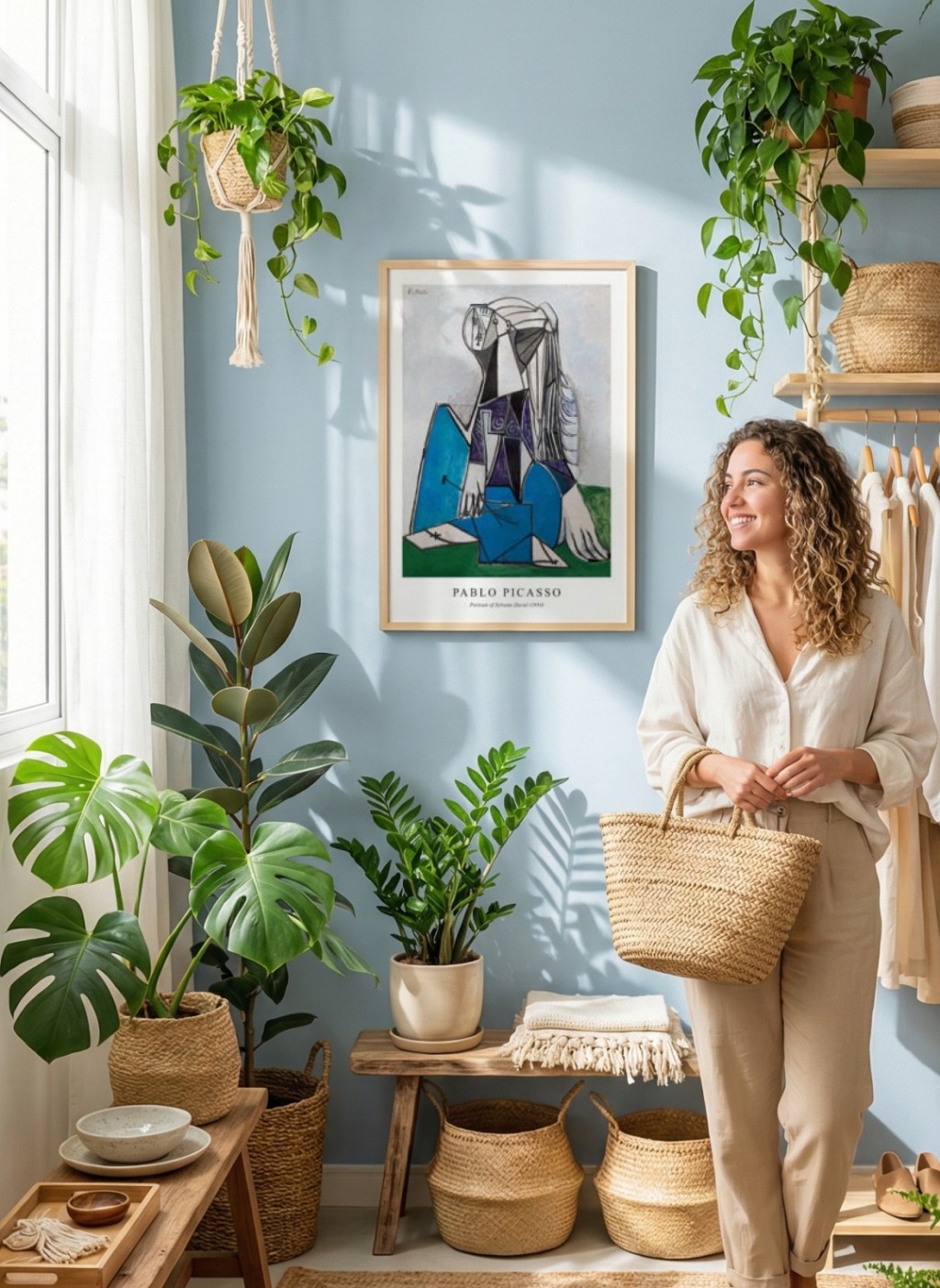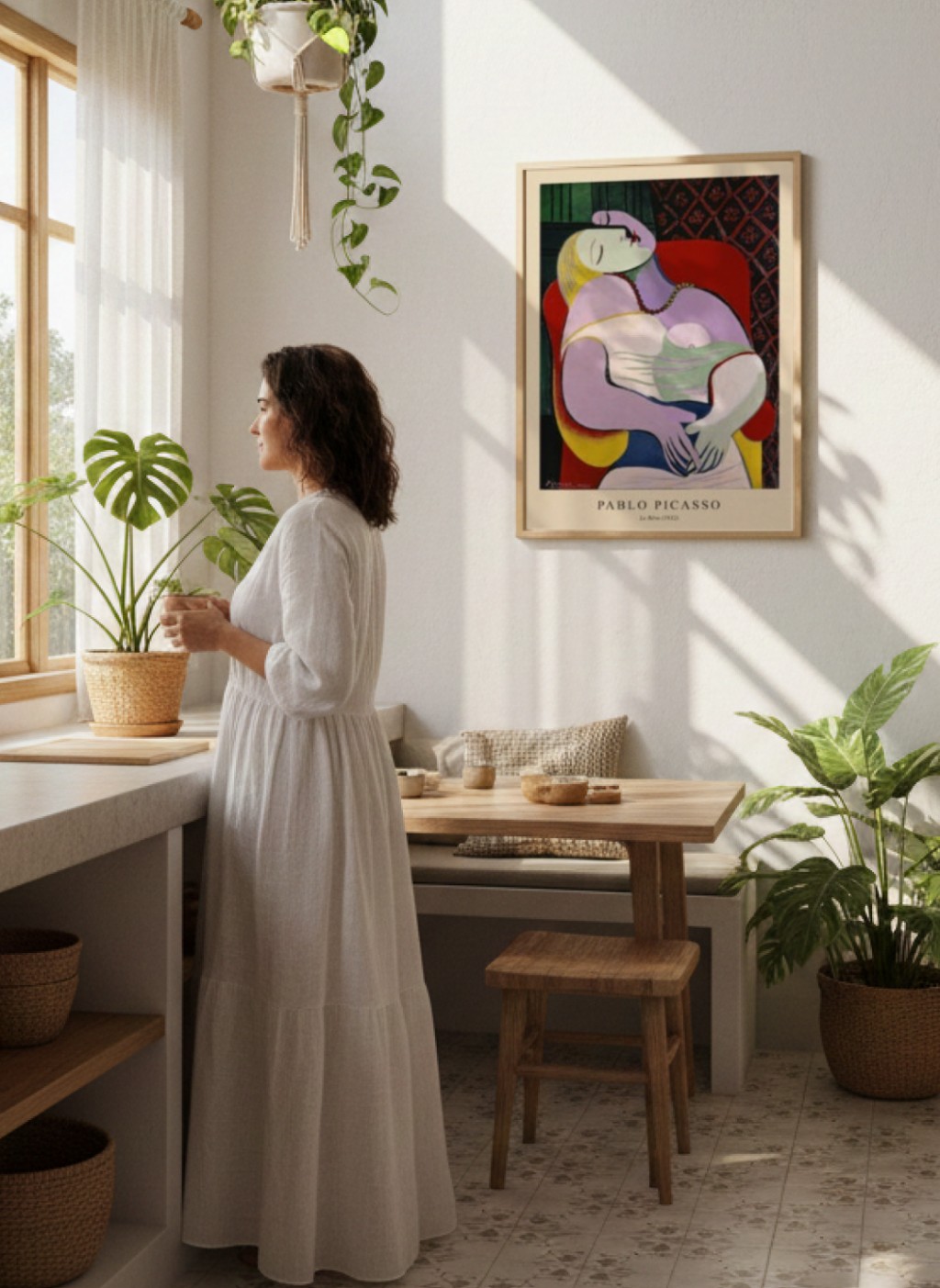 Marie-Thérèse apareceu como linhas curvas, formas sensuais, cores quentes. É ela em Mulher adormecida (1932), em O sonho (1932) — uma das pinturas mais celebradas de Picasso, onde a figura feminina é representada em repouso com uma serenidade que contrasta com a deformação controlada das formas. O rosto é visto de frente e de perfil ao mesmo tempo, os volumes do corpo são generosos e fluidos. Havia prazer nessa tela, algo que o cubismo analítico nunca permitiu.