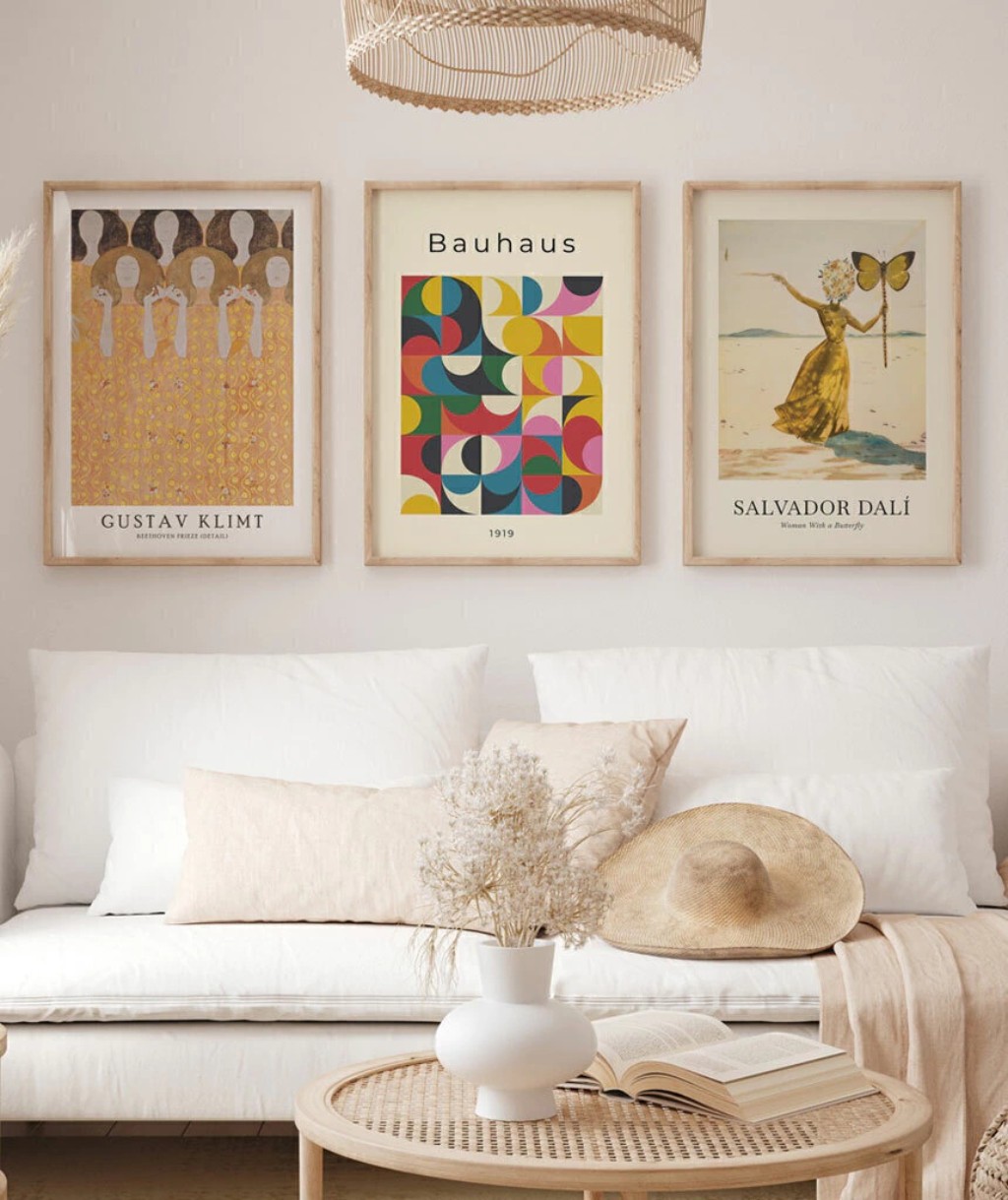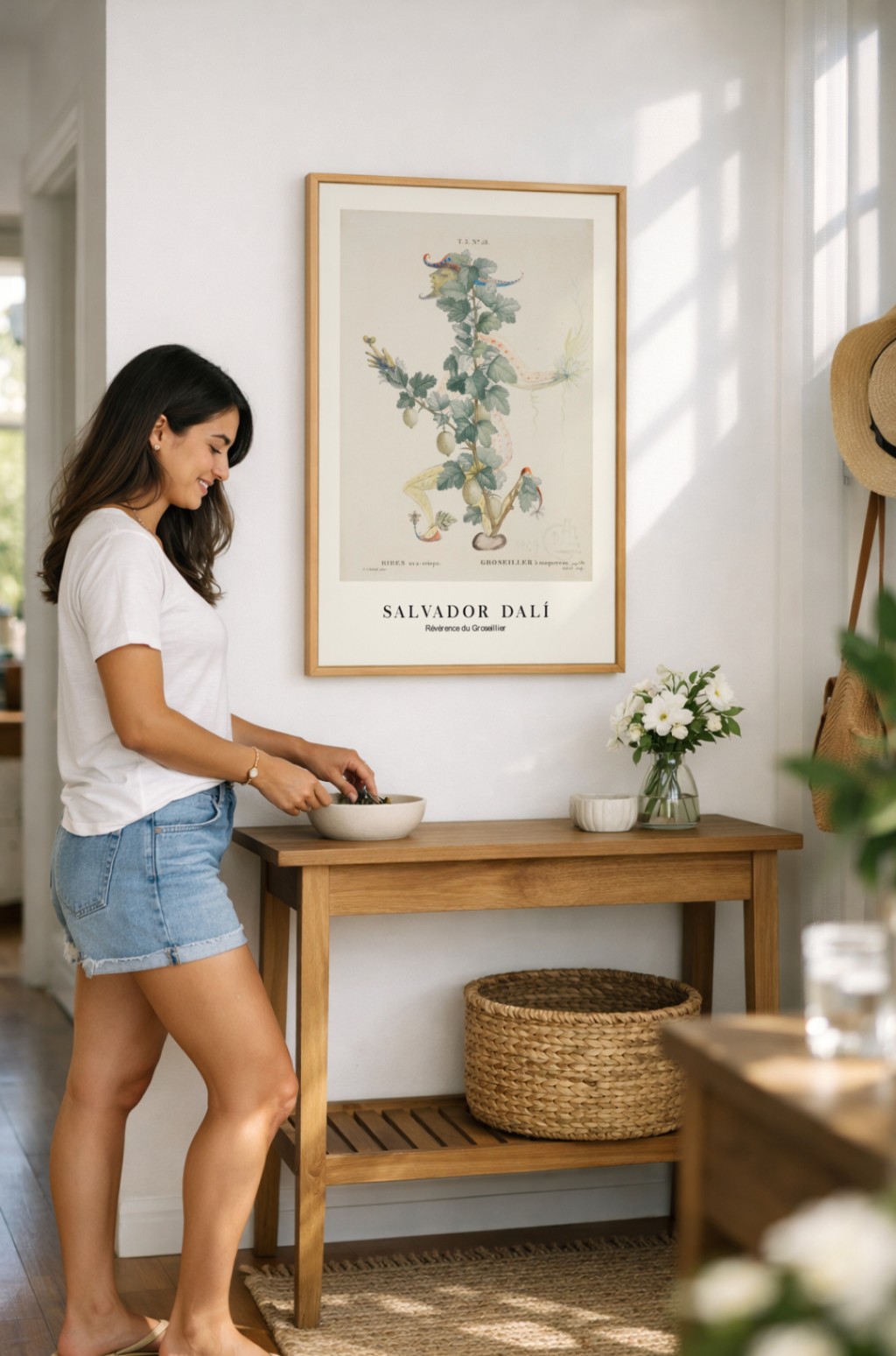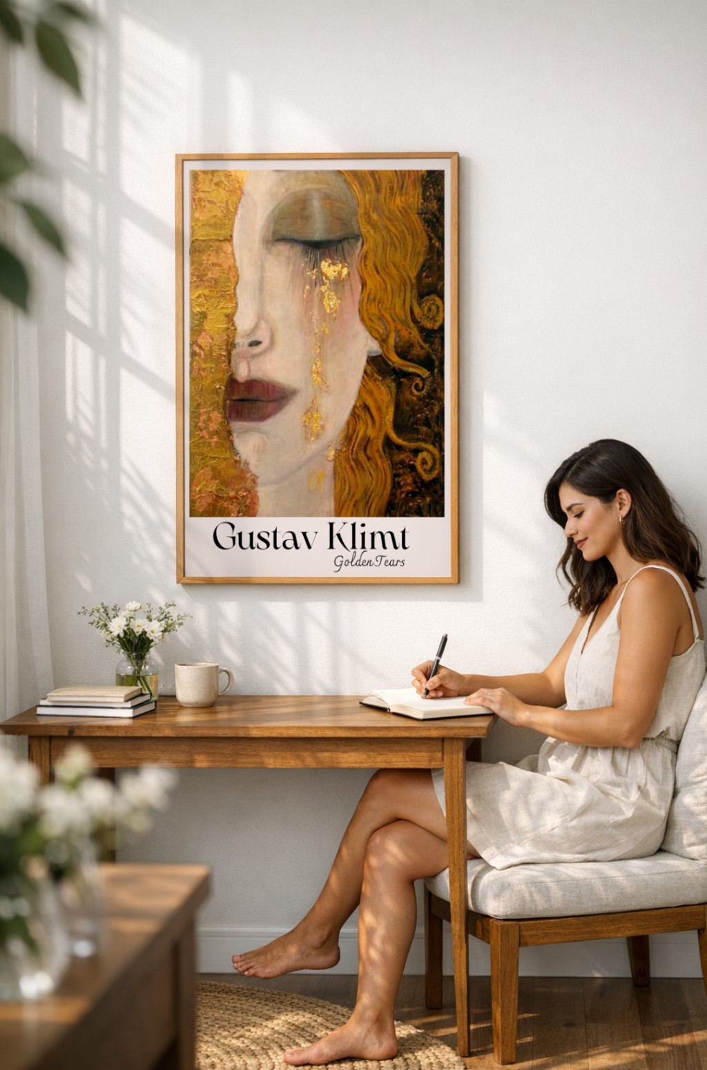 À primeira vista, parecem incompatíveis: Klimt é ornamento, padrão, superfície dourada e composição densa. Dalí é espaço, profundidade, paisagem onírica com horizonte vasto. Mas é exatamente essa oposição que os torna um par poderoso. Um equilibra o outro — e juntos cobrem os dois extremos da experiência visual que um ambiente pode oferecer.