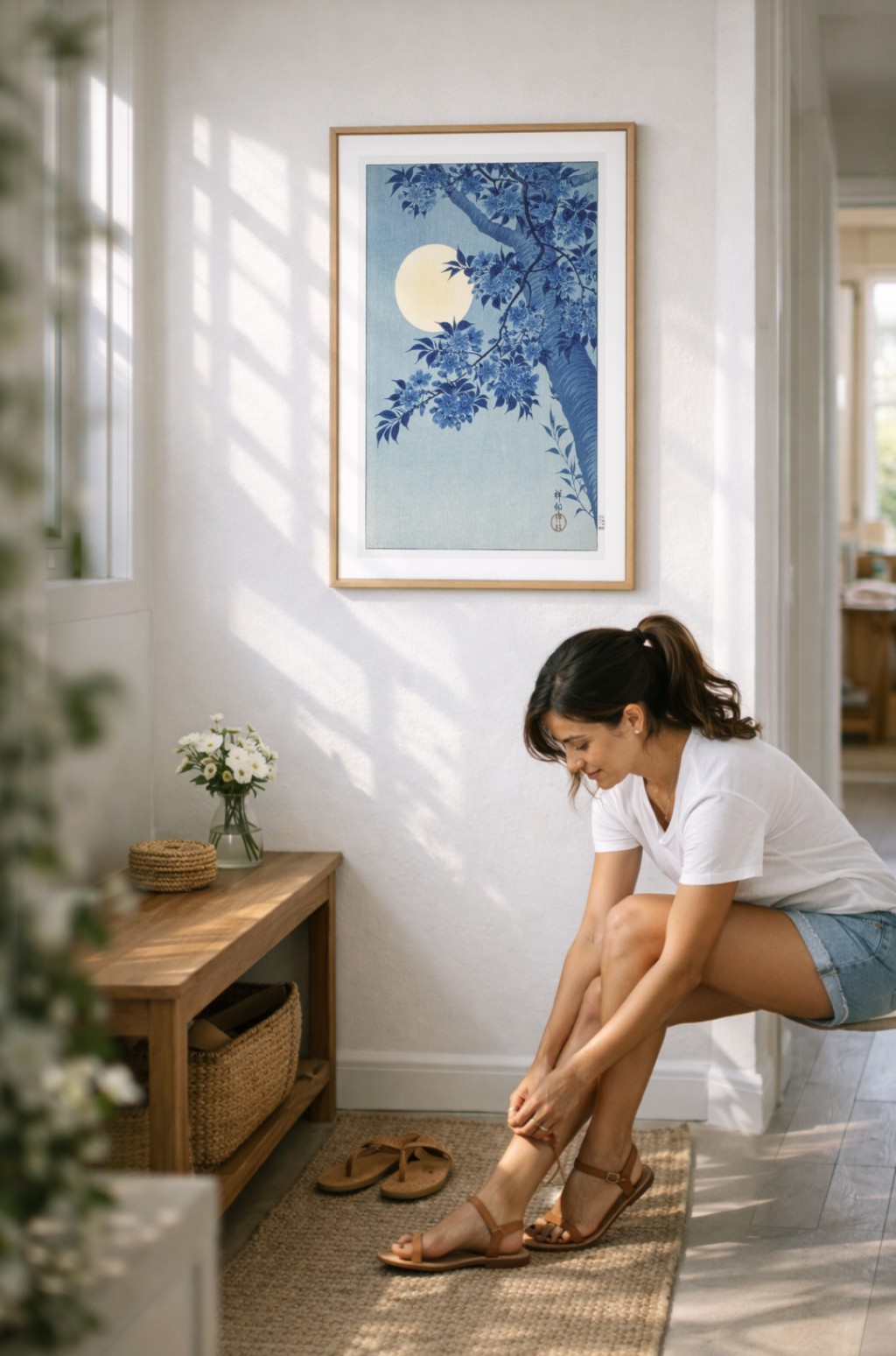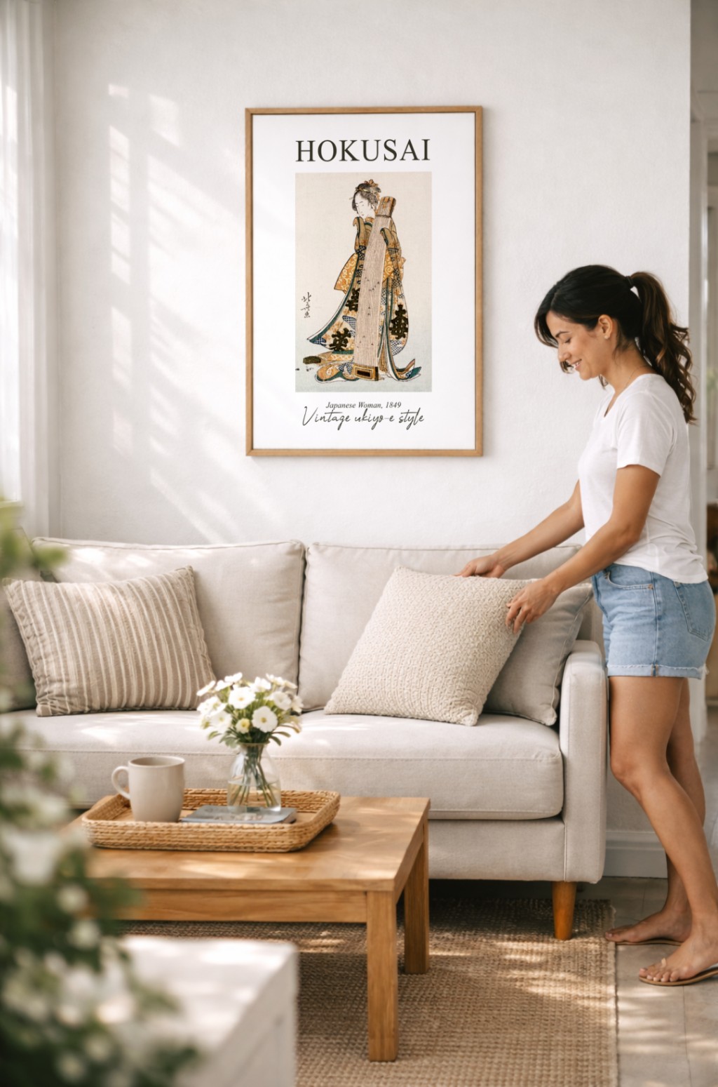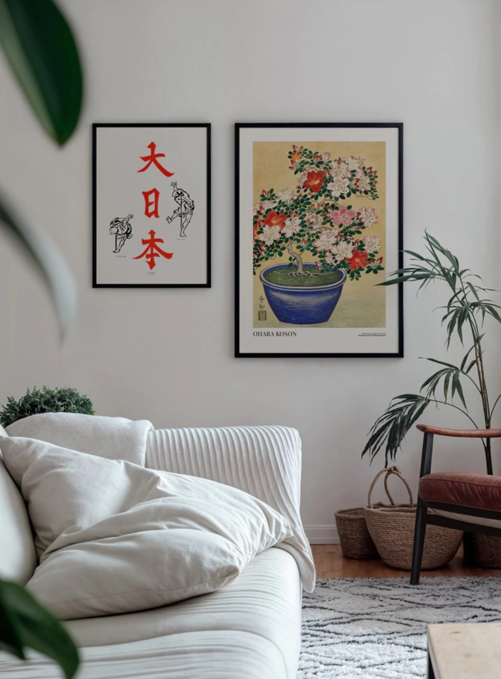Ohara Koson e Hokusai são os dois nomes mais representativos do ukiyo-e no catálogo da Moderna — e, apesar de compartilharem a mesma tradição, chegaram a linguagens visuais muito distintas. Koson é intimidade: pequenos pássaros, flores delicadas, composição contida e silêncio. Hokusai é grandiosidade: ondas que dominam o quadro, montanhas que definem o horizonte, natureza como força. É o par perfeito para quem quer construir uma narrativa visual com dois capítulos de tônica diferente.