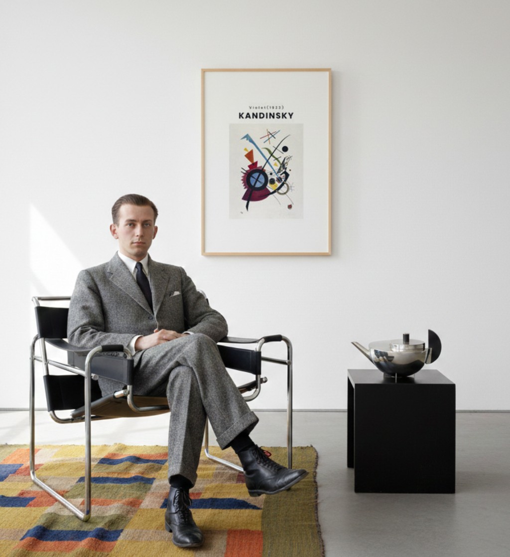 Quadro Violet 1923, de Kandinsky, na parede. Cadeira Wassily e Marcel Breuer, seu inventor, sentado. O bule MT49 na mesa lateral e tapeçaria Gunta Stölzl embaixo da cadeira.