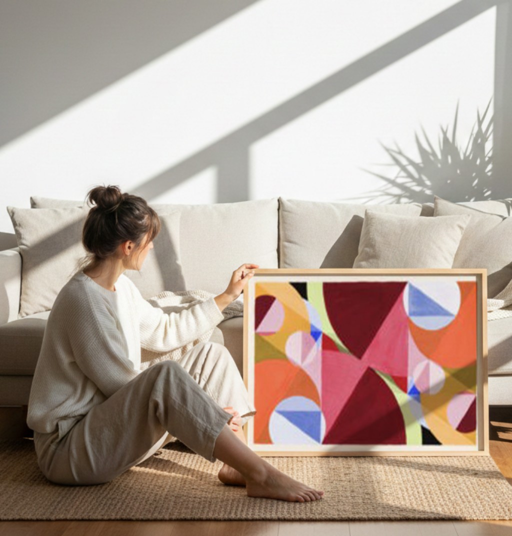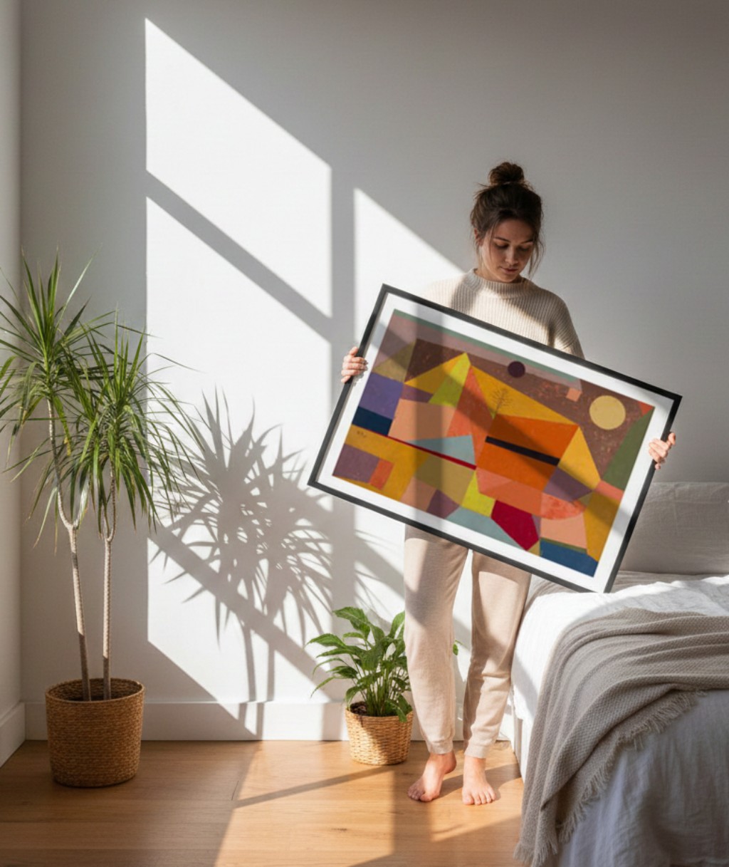 Quadros inspirados na Bauhaus não envelhecem porque não dependem de referências temporais específicas. Uma paisagem de Klee fragmentada em planos cromáticos funciona tanto em um apartamento minimalista quanto em um loft industrial. Uma composição de Kandinsky com círculos e triângulos dialoga com móveis de tubo de aço tanto quanto com peças contemporâneas de madeira clara. A geometria de Schillinger conversa com azulejos hidráulicos tradicionais e com painéis de LED programáveis.