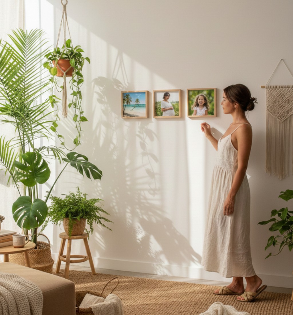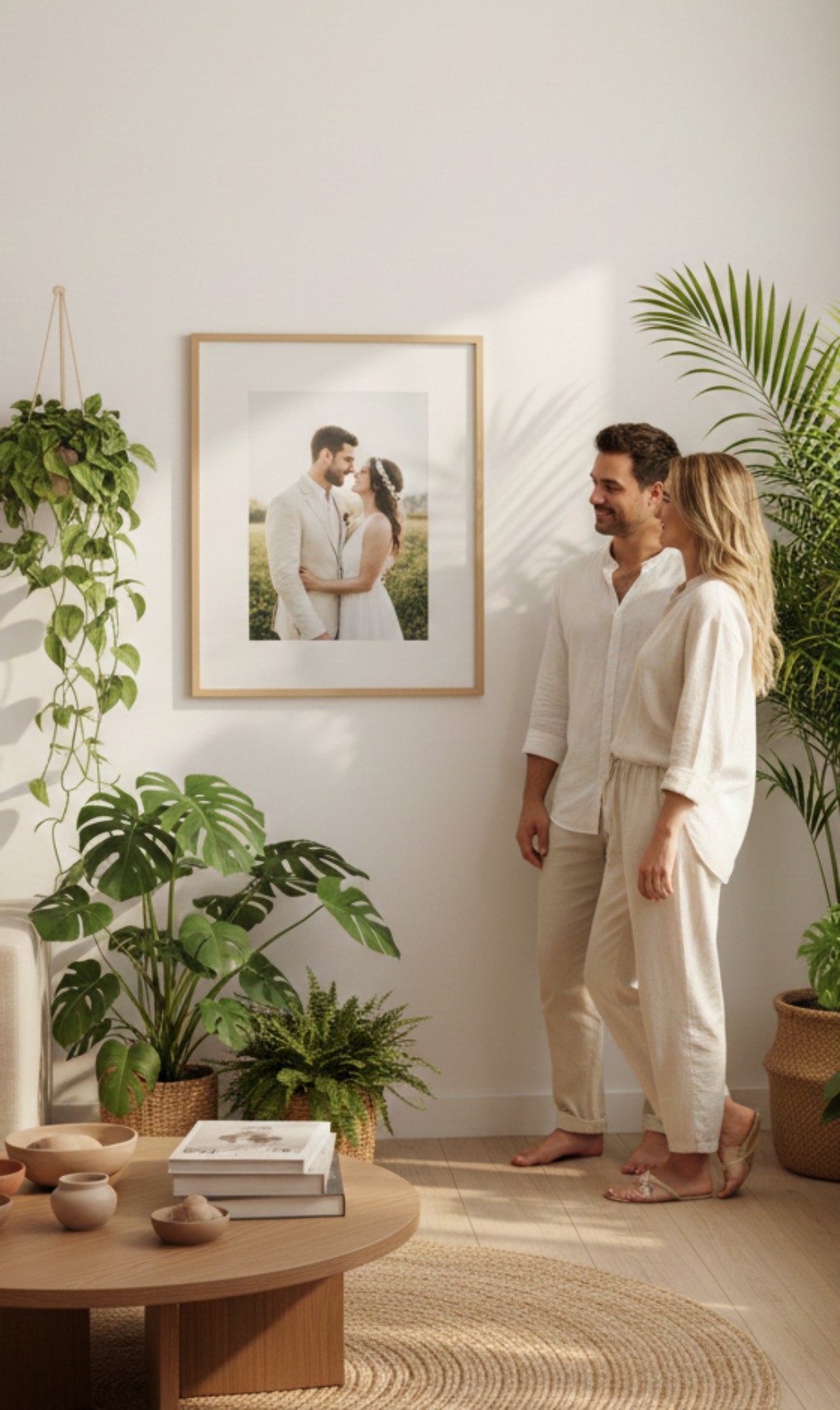Minimalismo personalizado: Composições limpas com uma ou poucas imagens impactantes, privilegiando espaços brancos e molduras discretas.