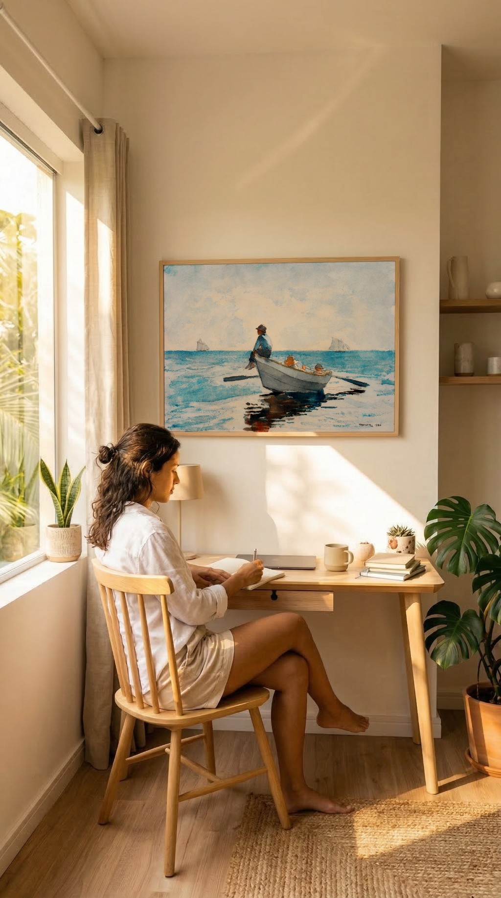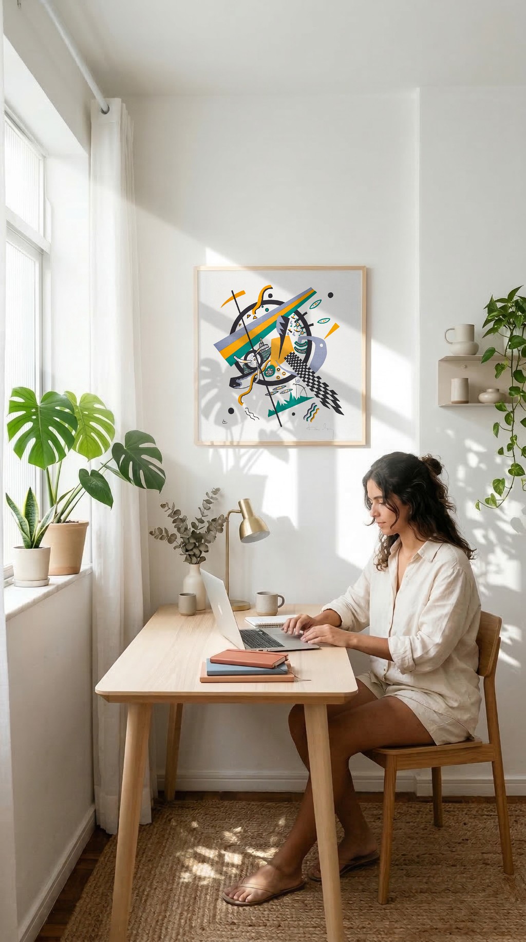 O home office tem a vantagem da liberdade total de escolha — e a armadilha da falta de critério. Sem um briefing externo para guiar a seleção, é fácil acabar com paredes genéricas que não dizem nada. A decisão mais importante aqui é: o que você quer sentir enquanto trabalha? Foco e contenção pedem minimalismo — uma peça grande acima da mesa, paleta neutra, ausência de distração. Energia e criatividade pedem mais cor, composições mais dinâmicas. Uma dica prática: a parede de fundo das videochamadas merece atenção especial — ela é, literalmente, o cenário com que você se apresenta profissionalmente para o mundo.