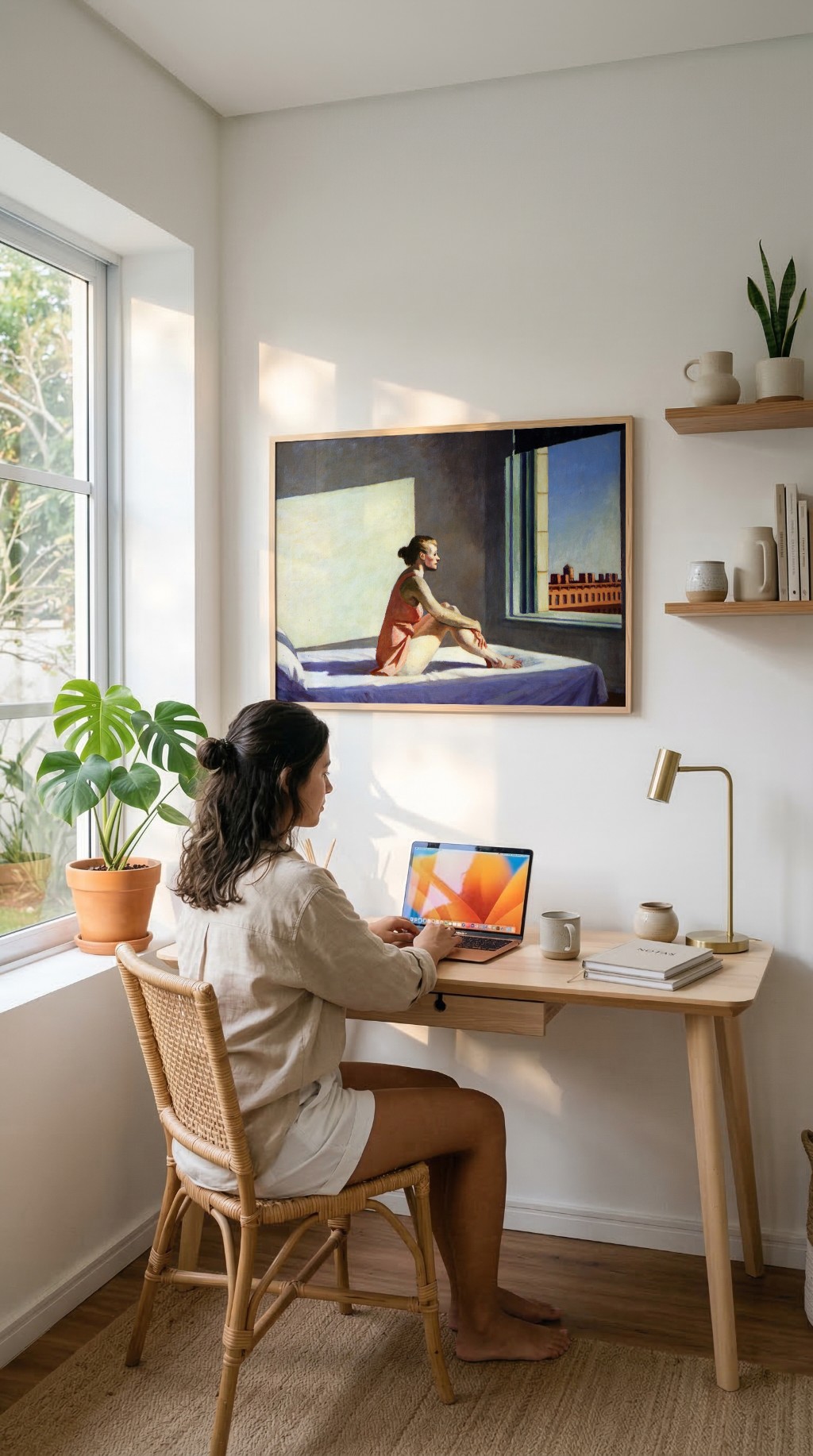 Botticelli executava briefings dos Médici com a precisão de quem entende que arte e intenção são inseparáveis. Hopper mostrou que a concentração tem uma beleza própria, sem precisar de drama. O que eles tinham em comum era clareza de propósito: cada obra foi feita para comunicar algo específico, em um contexto específico. A escolha de quadros decorativos para escritório funciona pela mesma lógica. Não é sobre preencher parede — é sobre declarar, com imagens, o que o espaço representa.