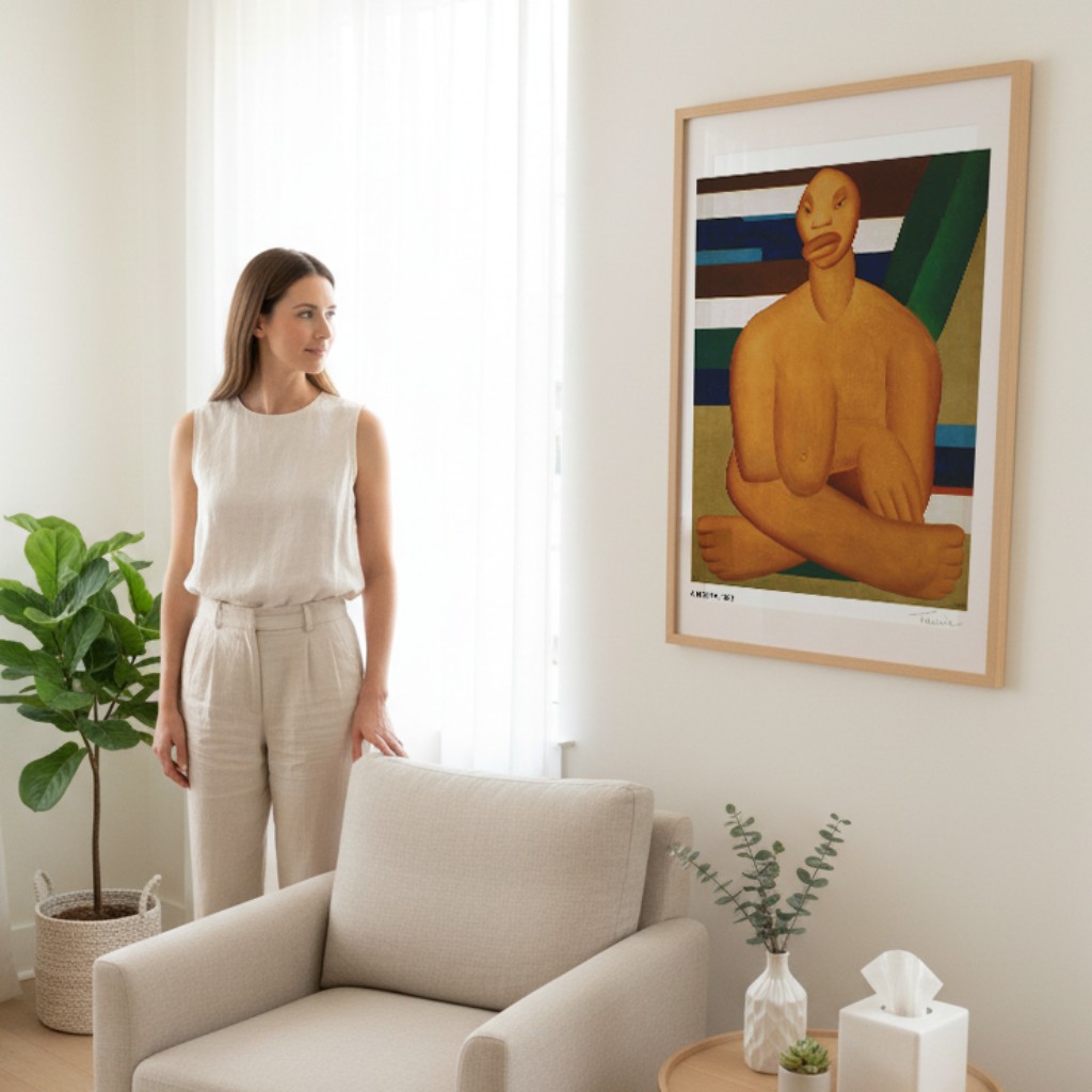 A Negra, pintada poucos meses depois, em 1923, já antecipava essa distorção expressiva. A figura feminina negra, com um seio monumental e lábios volumosos, ocupa quase toda a tela. As formas são simplificadas ao extremo, reduzidas a volumes geométricos básicos. Há uma monumentalidade que dignifica a figura, mas também um processo de síntese formal que a transforma em quase abstração. Inspirada nas lembranças das negras que trabalhavam nas fazendas de sua infância, Tarsila criou uma imagem icônica que dialoga com o primitivismo europeu, mas a partir de uma vivência real, não de uma projeção exotizante.