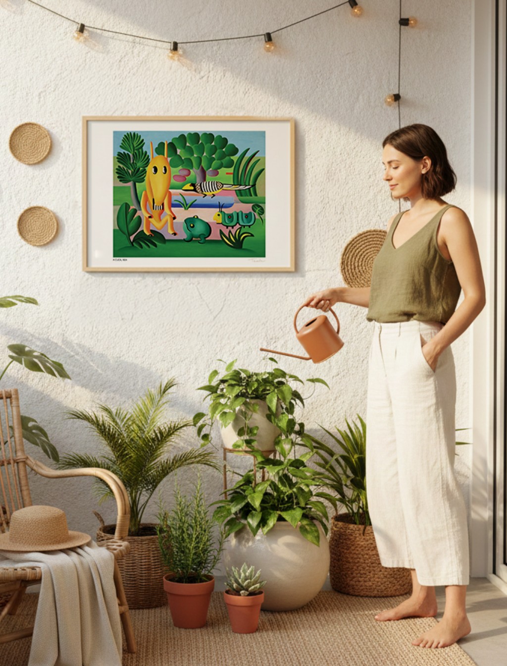 A Cuca, figura do folclore brasileiro, ganha tratamento pictórico que transforma o personagem infantil assustador em uma composição de formas orgânicas e cores vibrantes. A obra demonstra como Tarsila conseguia transitar entre referências eruditas e populares sem hierarquizá-las.