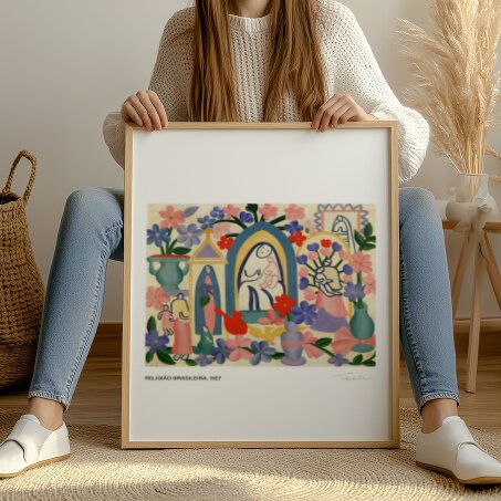Religião Brasileira é o olhar de Tarsila sobre a religiosidade. Com formas simplificadas e cores tropicais, mostra itens do cotidiano urbano em uma arte vibrante e afetiva.